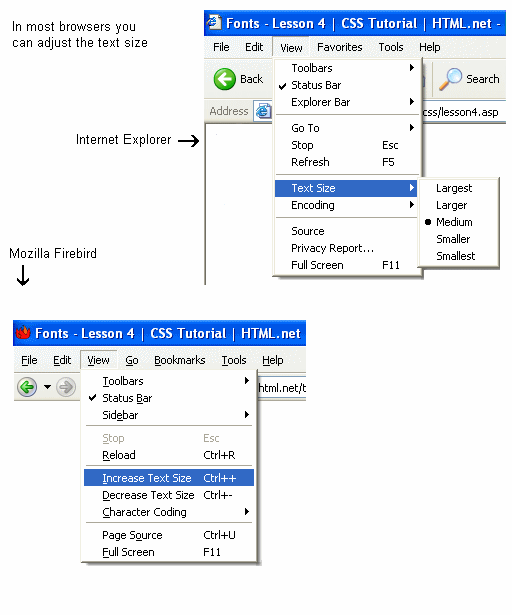 Es gibt einen grundlegenden Unterschied zwischen den vier obigen Einheiten. ‘px’ und ‘pt’ bringen die Schrift auf eine absolute Größe, während es ‘%’ und ‘em’ dem Nutzer erlaubt, die Größe so zu verändern, dass es ihm/ihr passend erscheint. Viele Internetnutzer sind behindert, älter, sehbehindert oder ‘leiden’ unter der schlechten Qualität Ihres Monitors. Um Ihre Webseite für jederman zugänglich zu machen, sollten Sie veränderbare Einheiten, wie ‘%’ oder ‘em’, verwenden.